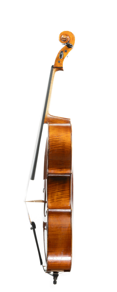 This lovely 3/4 sized cello probably came from the Mittenwald workshop of Anyon Dietl. After WWII, Dietl and his family fled from the Vogtland, in northeastern Germany, to escape the communist regimes of Czechoslovakia and East Germany. They came much further south than most of Dietl's contemporaries, to settle and buils a workshop in the Bavarian mountain town of Mittenwald.