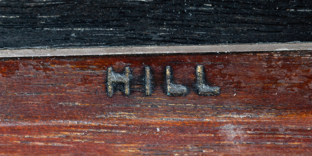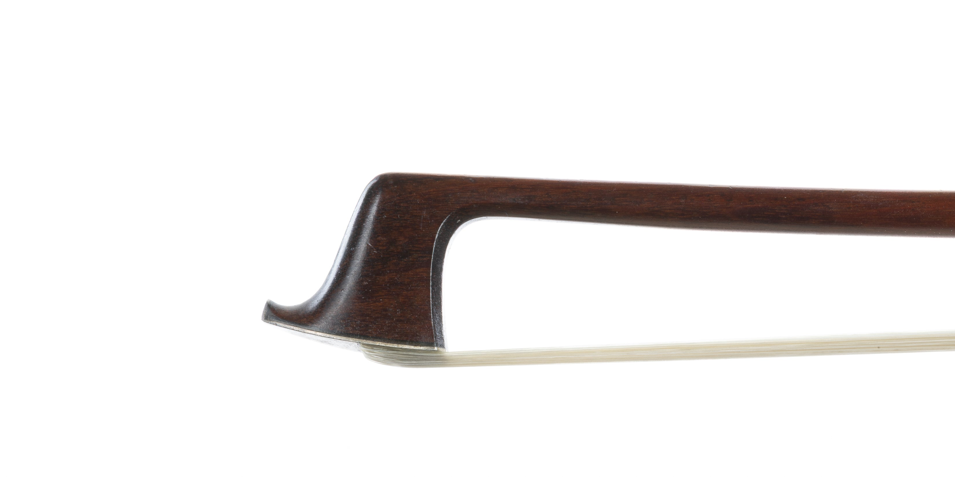 W.E. Hill and Sons, expert appraisers and noted violin makers, are now primarily known for their bows, produced under the eagle eye of master bowmaker William Retford. This viola bow, with its “Hill” stamp, is technically rated as their fourth, or lowest grade bow, but in our experience, those “Hill” bows made before WWII often have very fine playing characteristics. This example, stamped “3”on the silver tip face, was made by Albert Lesson, one of their better makers, and the “2” and “8”, on either side of the “match” letter “C” on the underside of the stick probably record the year, “1928”, in which the bow was made. The round, pernambuco stick is made from very well-selected wood, the legato strokes showing no signs of the “shake” sometimes found in their middle grade bows, and with excellent resilience, articulation and bounce.