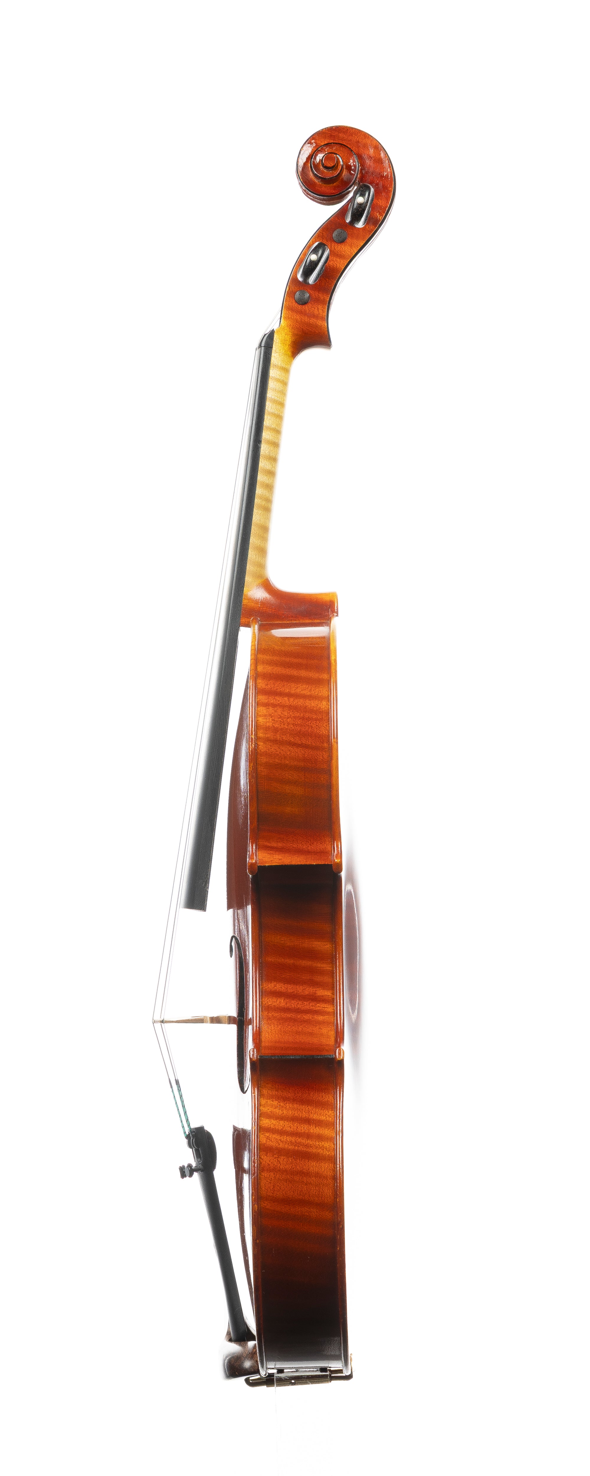 Dean Chandler spent time in the early 1990s in his grandfather’s, Ian Sweetman’s workshop, learning the family craft of violin making. This striking viola, the second of his output, is modelled after Guarneri del Gesu. Despite its relatively small body size, at 15 ½ inches, it has an impressively full, resonant tone, with a lovely bell-like openness. The lower registers are surprisingly strong, and upper positions on all strings continue to speak well. This will be an excellent choice for a viola player looking for an instrument with good performance capabilities.