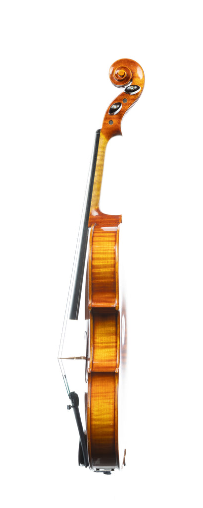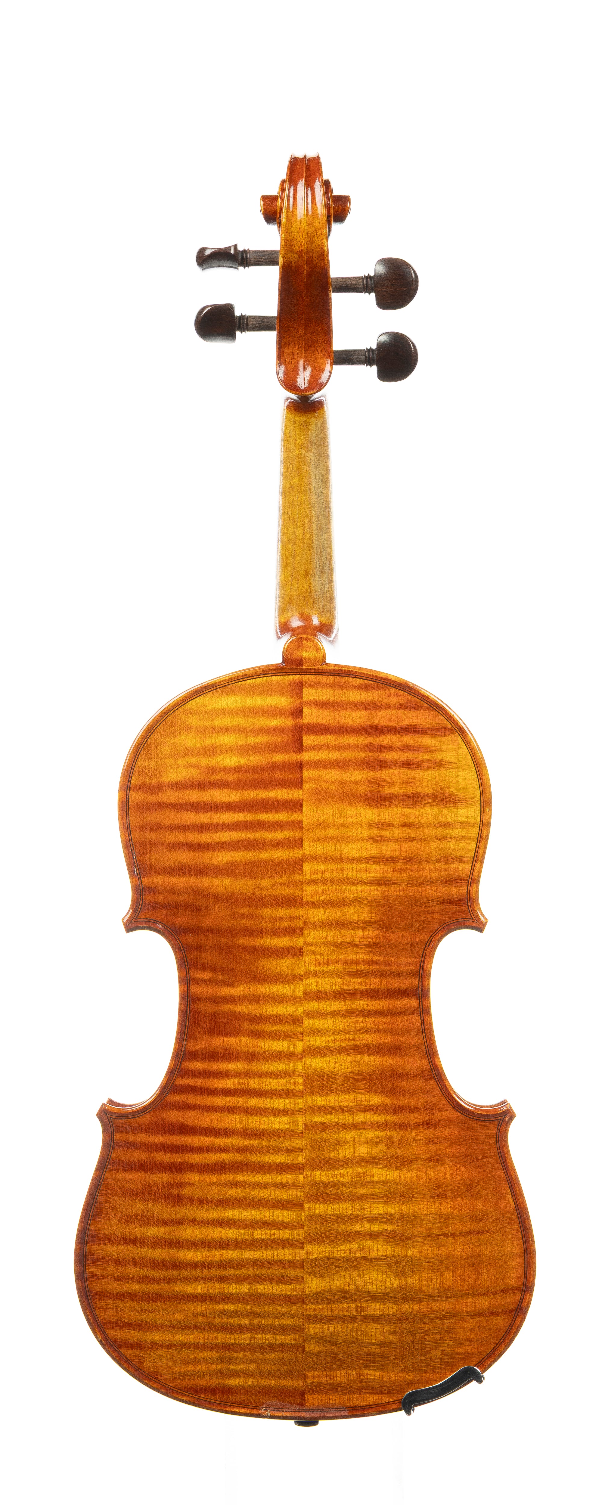 With its deep ribs and full arching, this small viola, inspired by a 1715 violin on Antonio Stradavari, has a surprisingly full resonant tone, with a bell-like clarity on the upper strings. The neck is slightly long in relation to the body stop length allowing easy access to the upper registers for younger players. A vividly flamed maple back and attractive spruce tone wood for the belly make this instrument a very appealing choice for a player moving onto their first viola.