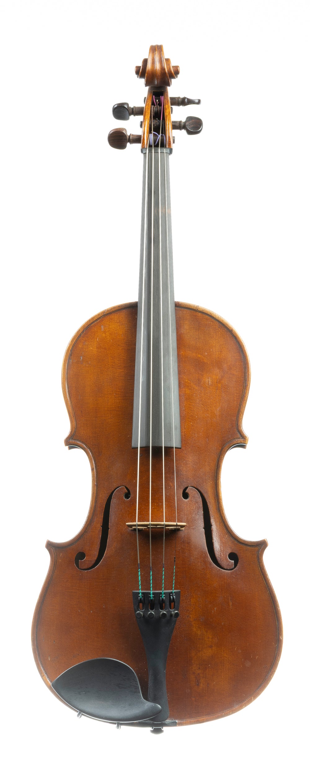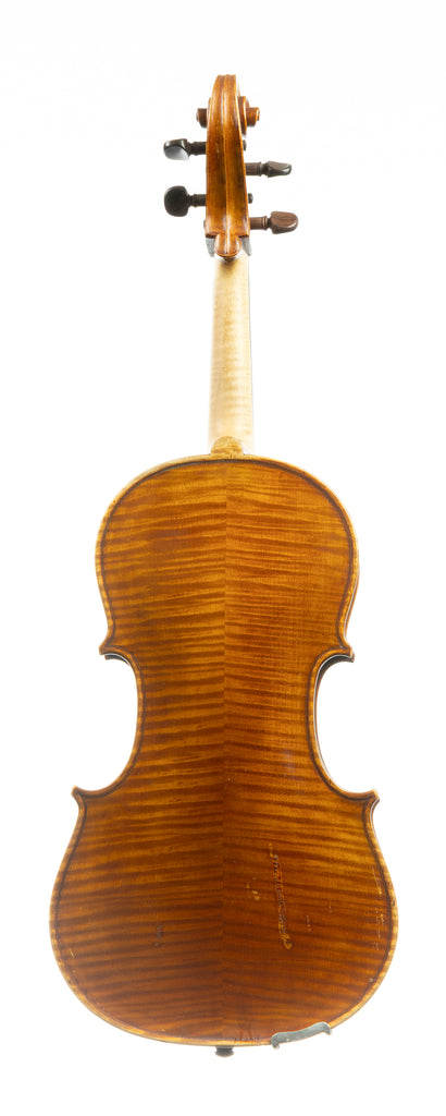 Not much is known about this lovely-looking 16 ¼ “ (415mm) viola except the location of his workshop in the market town of Wetherby in North Yorkshire equidistant from Leeds, York and Harrogate. This instrument is his first viola, but it’s clear he was a proficient violin maker before this point, with well-executed purfling, a handsome scroll, distinctive f holes, nicely-rounded edges, and a very pleasing oil varnish. The tone is rich and warm, with a clear upper register and plenty of energy in the lower strings .