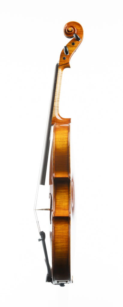 This handsome Tommaso Balestrieri copy viola labeled as being made in Germany in 1986, has a handwritten over-signature which may indicate it was marketed by Tan Violins in Edmonton, Canda, while the wood choice and workmanship tend towards an Asian origin. The viola with a back length of 16 1/4” (416mm), is skillfully made, and has a very lively, clear, resonant tone, easily produced, and with richness and vibrancy on the lower strings and clarity without harshness in the upper register. This will be a very rewarding instrument for a student advancing through the grades.
