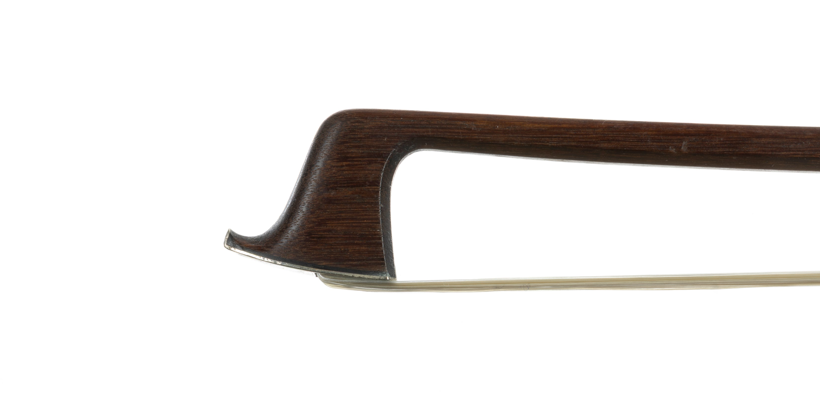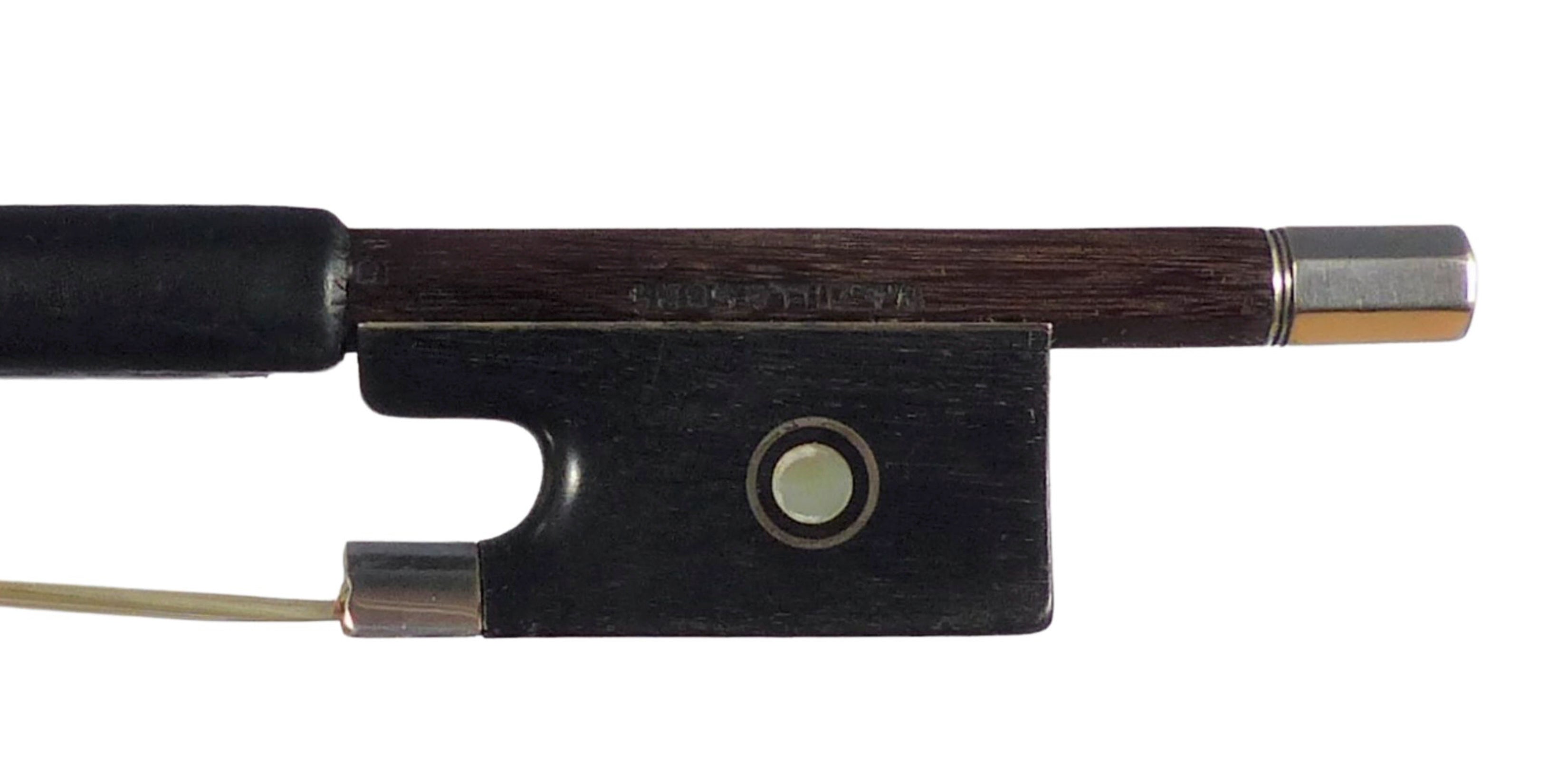 Bows made by the world-famous violin workshops of W.E. Hill and Sons come in four different quality rankings, each one indicated by the stamp on the stick above the frog. The full stamp “W.E. Hill and Sons” on this bow shows us that this is one of their first grade bows, while the figure “3 ”, hidden under the hair on the silver tip face, demonstrates that this is the work of Albert Leeson, who worked at Hills from 1920 until his death in 1946. The pernambuco stick is octagonal, and the ebony frog has silver mounts. At 57.9 grams this is a relatively light bow, but it still pulls a warm, full sound, while delivering all the playing qualities one would expect from a bow of this lineage.