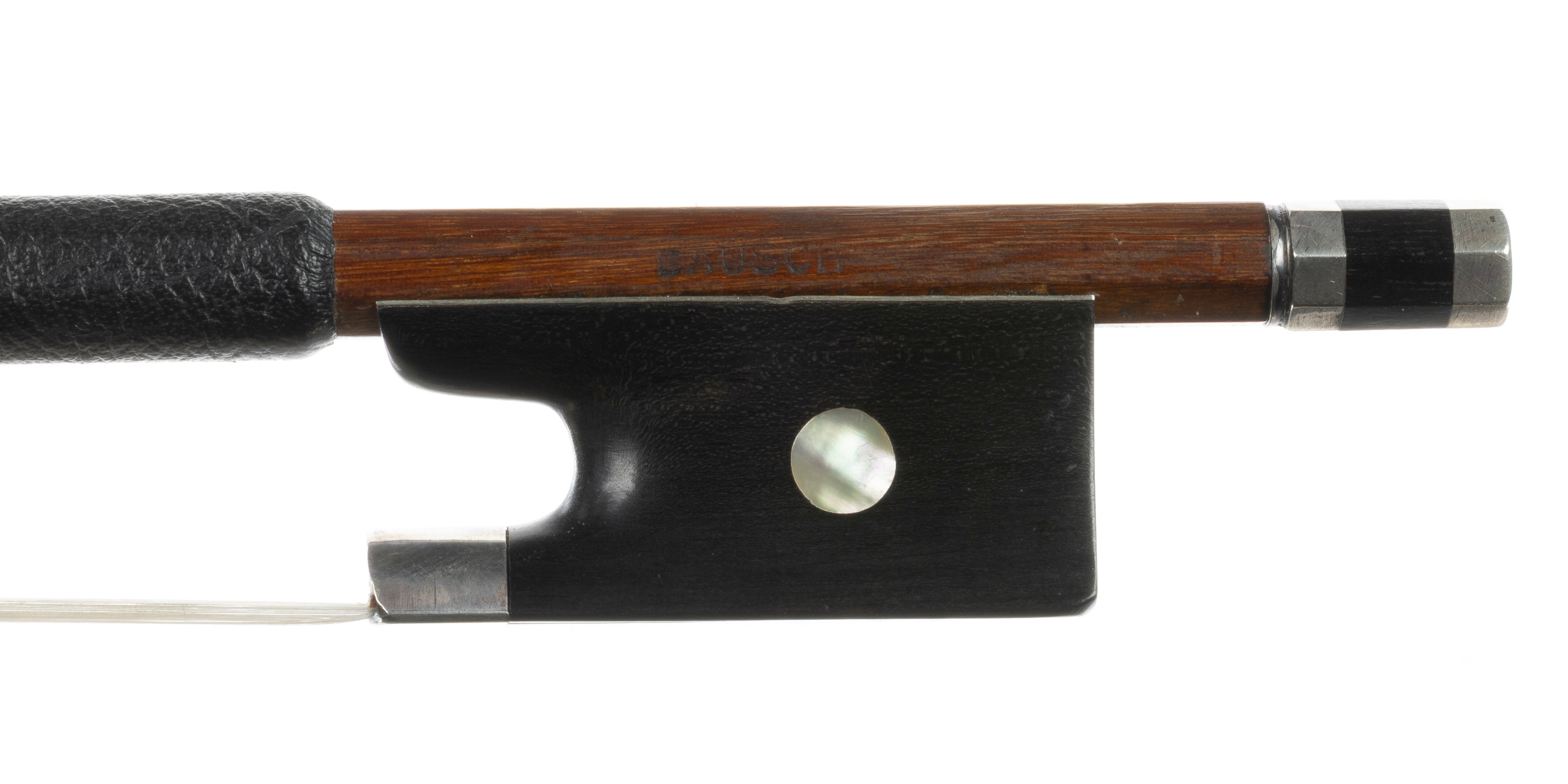 This silver-mounted bow is of a much higher standard than the many thousands of nickel-mounted German bows stamped “Bausch” that have been made for the student market. The stamp is so widespread because of the pre-eminence of bow maker Ludwig Christian August Bausch and his two sons. Although this bow’s head lacks the wide chamfers of most genuine Bausch bows, it has a pleasing, flowing elegance. The round stick, made of well-selected pernambuco, is very responsive, with excellent articulation at the tip and a clear but creamy sound.