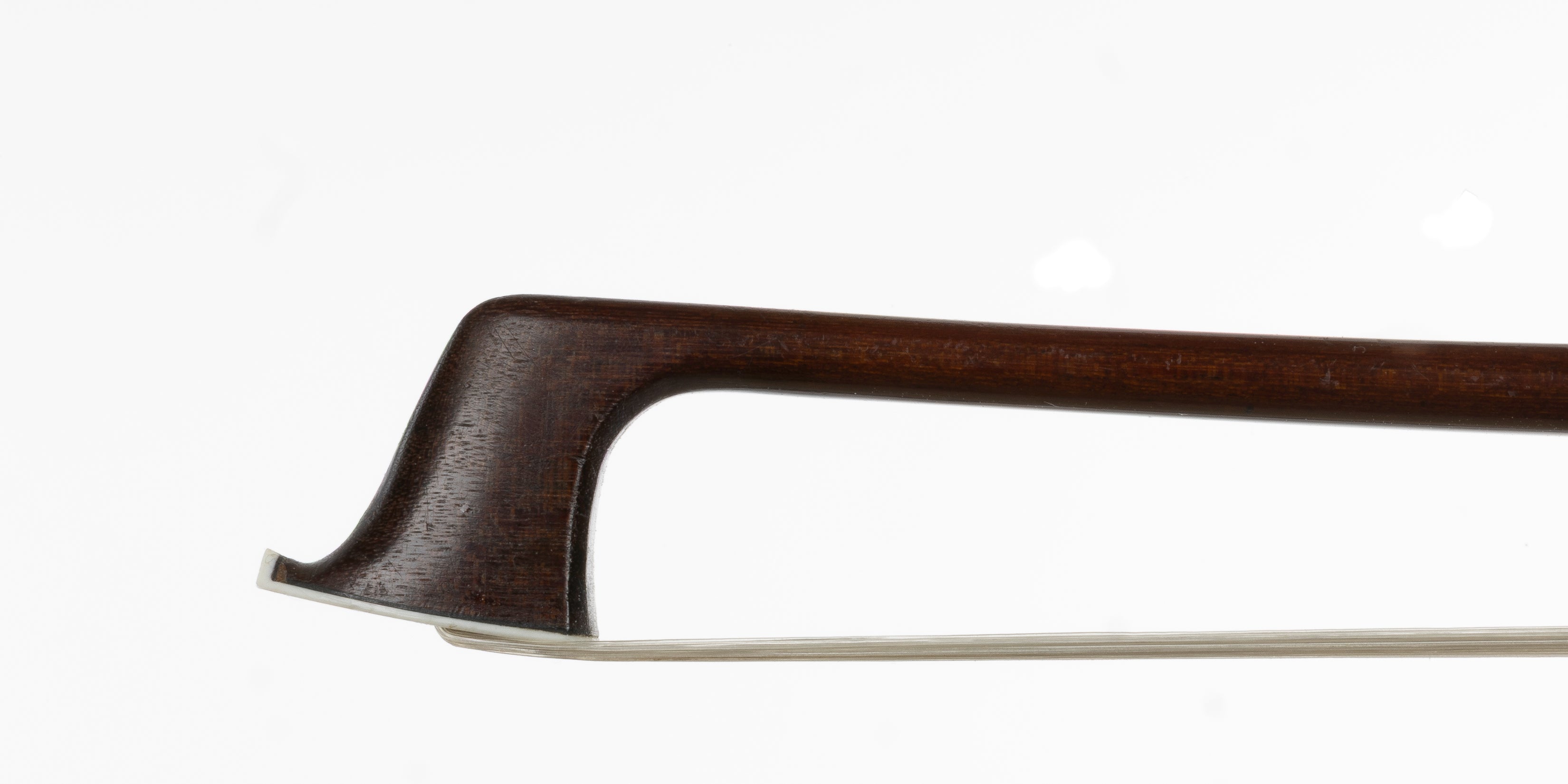 Old European bows like this, with stamps so worn they can hardly be read, can intrigue us for hours if not days. What we can say is that this bow was made with a well-selected, strong piece of pernambuco, that the head was carved in style, and that the bow produces a crisp, vibrant sound with very good articulation. The stick sits steadily on the string providing very reliable performance normally only expected from bows with an established pedigree, and a higher price.