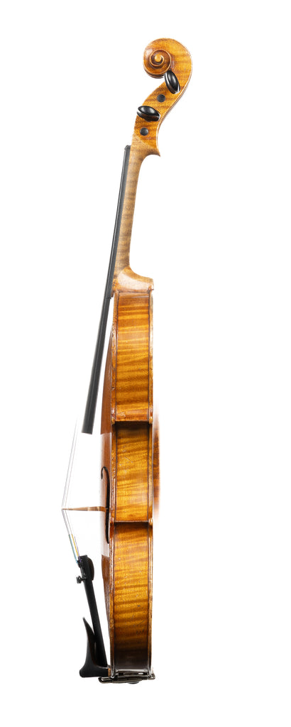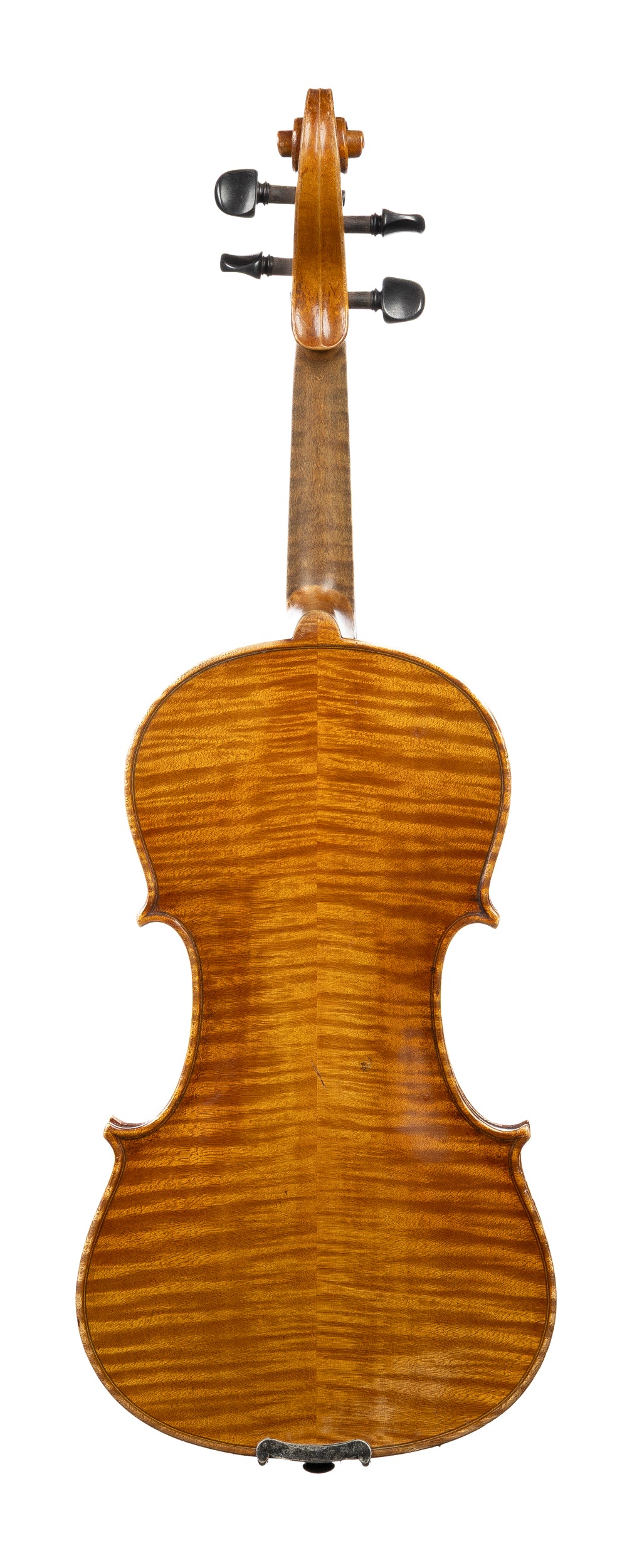 The Schuster family was founded by Georg Schuster, born in 1685 and established as a master violin maker in the Markneukirchen guild of violin makers by 1748. John Dilworth lists no less than 29 of his descendants in his violin and bow makers dictionary, working from the eighteenth century though to the modern times as both violin and bow markers in Markneukirchen, Schönbach and throughout Europe. Schuster and Co, based in Markneukirchen, dedicated themselves to making superior student instruments, basing their work on the great Cremonese masters, in this case Nicolas Amari. A golden yellow varnish complements attractively flamed maple and well-selected spruce. The tone is trye to the style-warm and clean, with a very pleasant characterful palette of colours.