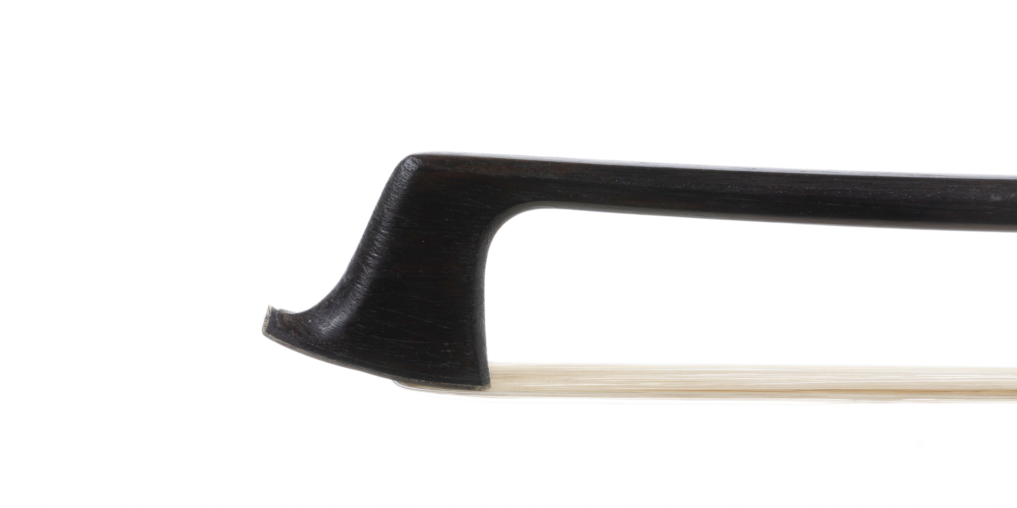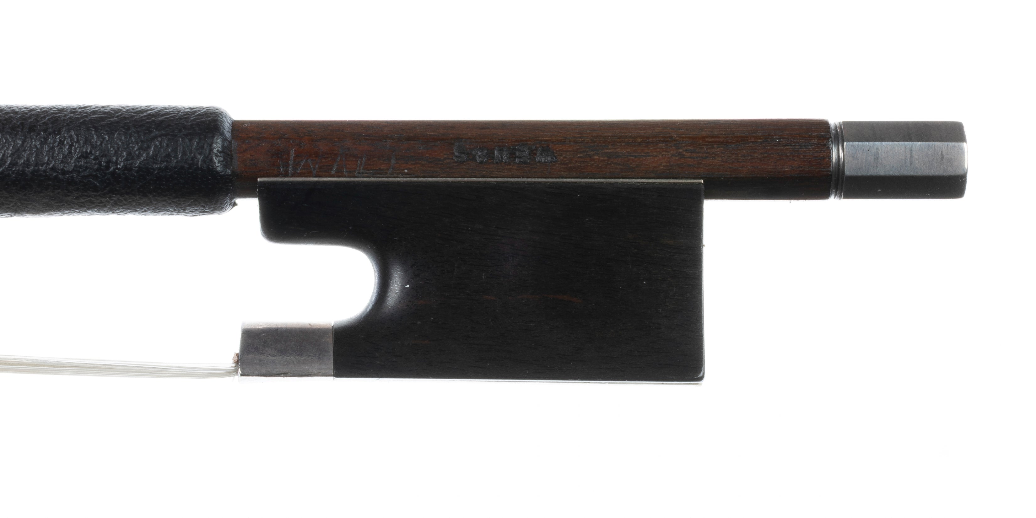 W.E. Hill and Sons, for a time one of the most authoritative and prestigious violin dealers in the world, also had their own workshops, making fine violins in the Anglo-French tradition, excellent bows, and luxury cases. Their bows came in several grades, distinguished by the stamp on the stick. This fine, octagonal violin bow is stamped “W.E. H & S”, classifying it as a bow in their second-to-top grade. It sits steadily on the string during fast legato strokes, bounces cleanly and crisply, and articulates well in all parts of the stick, making it a reliable and versatile bow for an advanced player.
